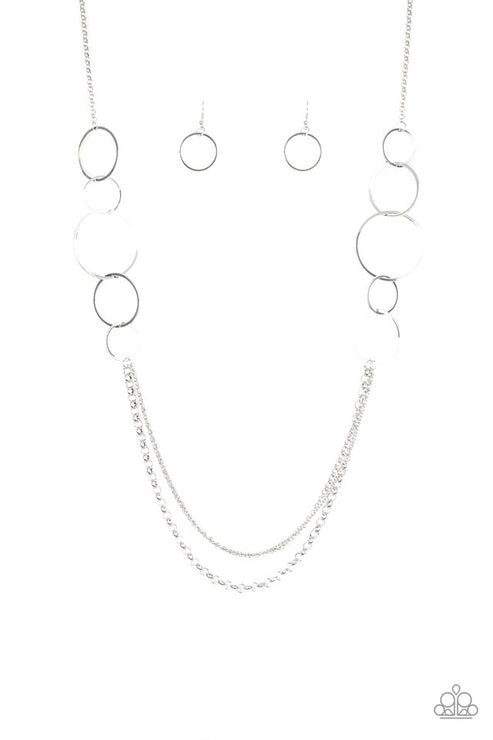 A collection of interlocking silver rings give way to layers of mismatched silver chains down the chest, creating a stunning tone-on-tone statement piece. Features an adjustable clasp closure. Sold as one individual necklace. Includes